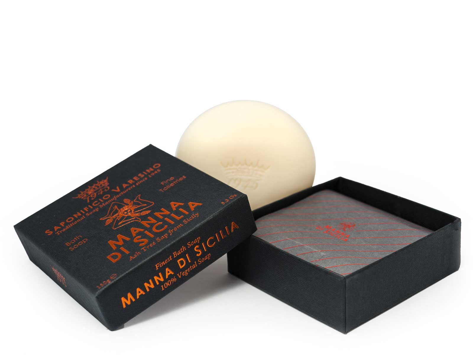 Saponificio Varesino Manna di Sicilia włoskie mydło do kąpieli umieszczone w eleganckim kartonowym pudełku z wygrawerowaną metaliczną folią, 150g