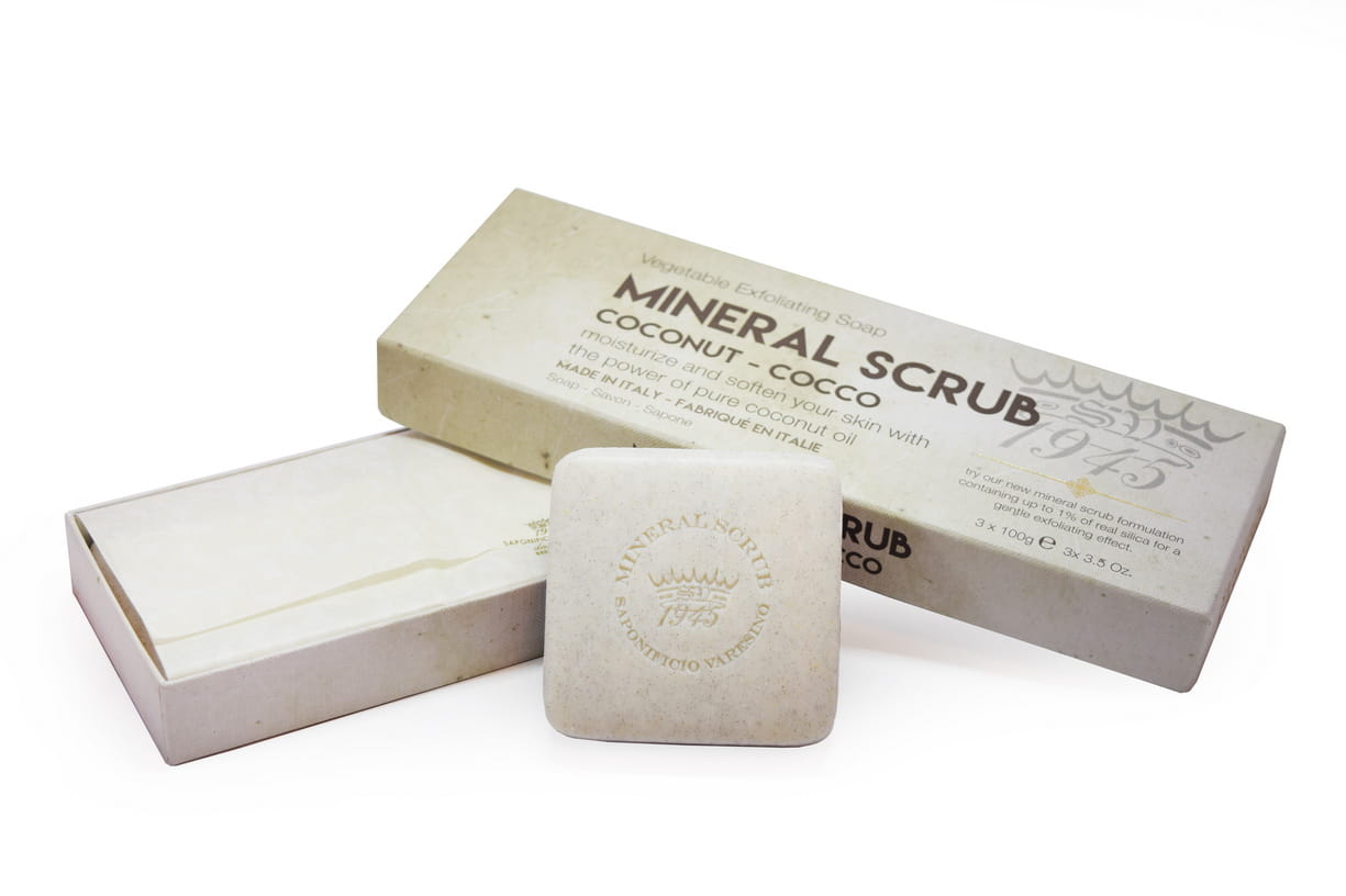 Kostki mydła z linii Mineral Scrub charakteryzują się czterema różnymi kolorami i czterema bardzo delikatnymi zapachami. Mydło zawarte w eleganckim pudełku różni się od innych mydeł, ponieważ ma oryginalny kwadratowy kształt. Pudełko zawiera 3 mydła po 100 gramów.